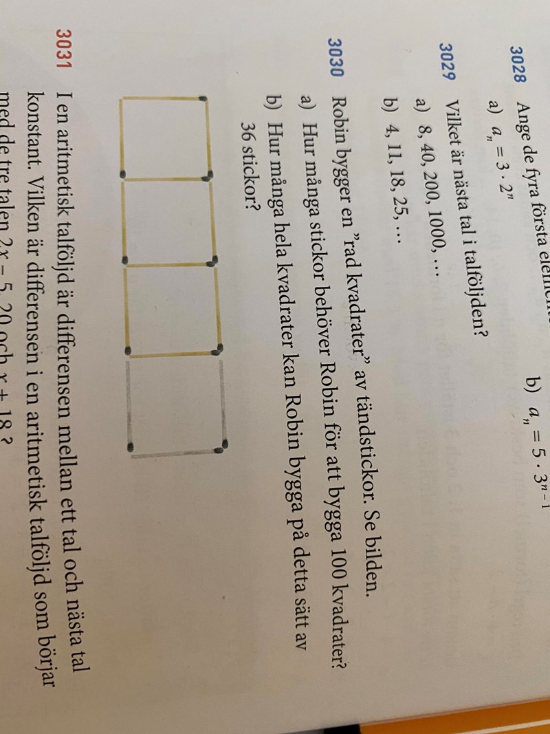 Jag förstår inte alls hur jag ska tänka här. Jag tänkte att man bara tar 3 • 100 eftersom det bara krävs 3 tändstickor för 1 kvadrat och han ska göra 100? Men det blir jättefel