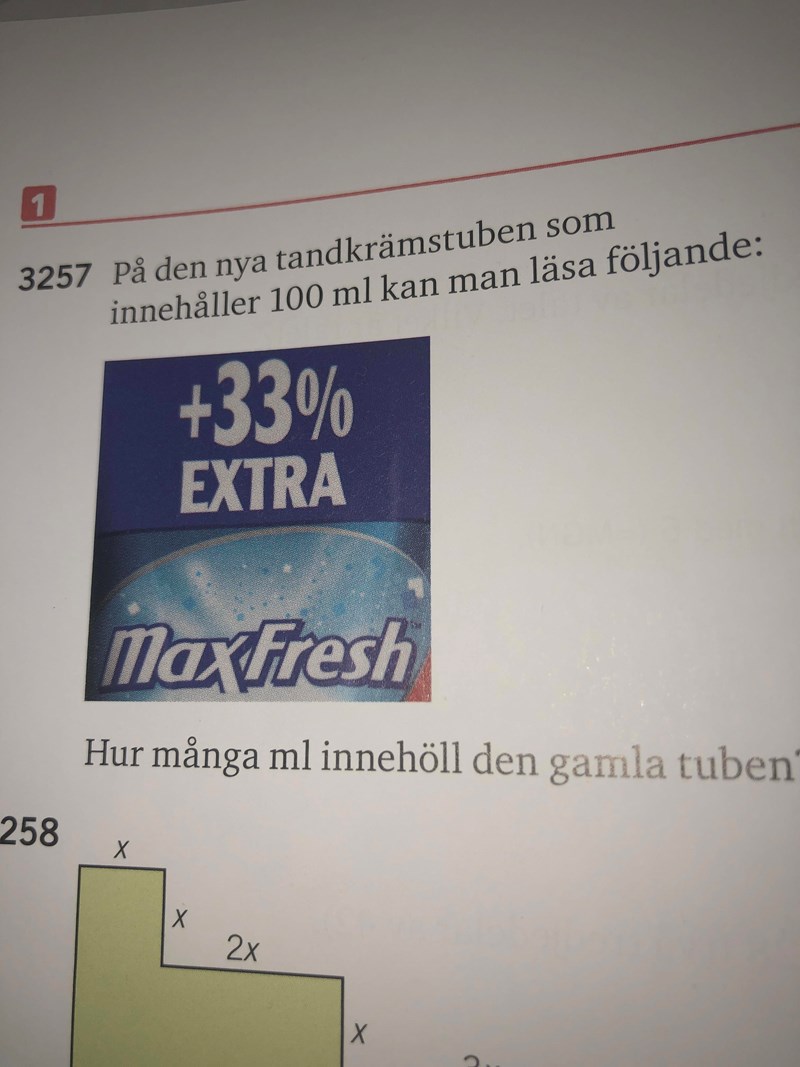 Du vet också att när du "lägger till" 33% av x till så fås 100 milliliter tandkräm (i den nya tuben). Kan du ställa upp detta som en ekvation? Vad är förändringsfaktorn?
