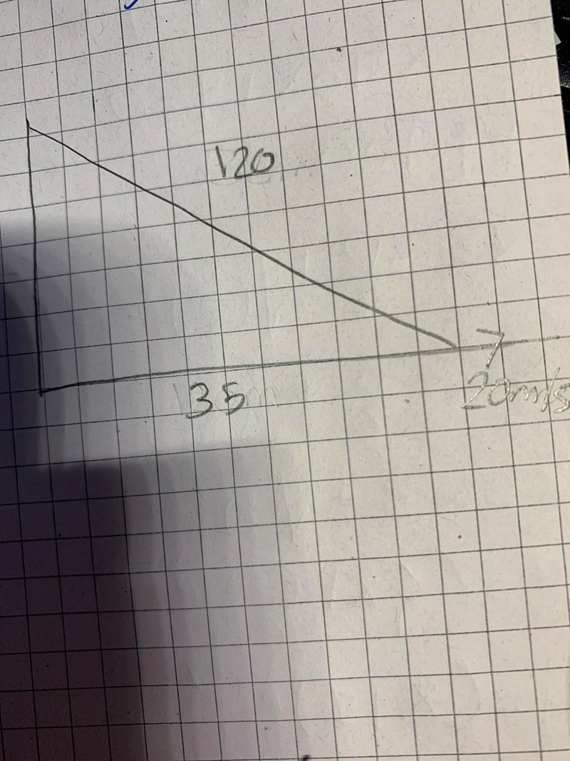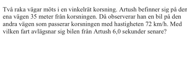 Triangeln verkar höra ihop med beräkningarna, men den stämmer inte med hur jag tolkar frågan. Bilen har på 6 sekunder kommit 120 m från korsningen, längs sin väg, inte längs synlinjen till Artush.