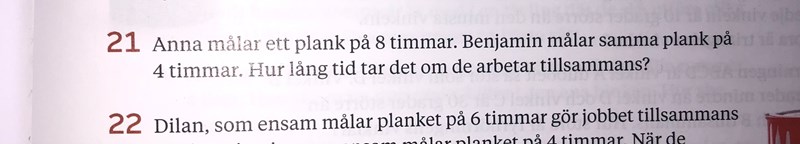 Yngve skrev:Den här och lilnande uppgifter kan lösas genom att flrst beräkna "målningshastigheten" för de inblandade personerna och sedan addera dessa målningshastigheter för att få den gemensamma målningshastigheten.