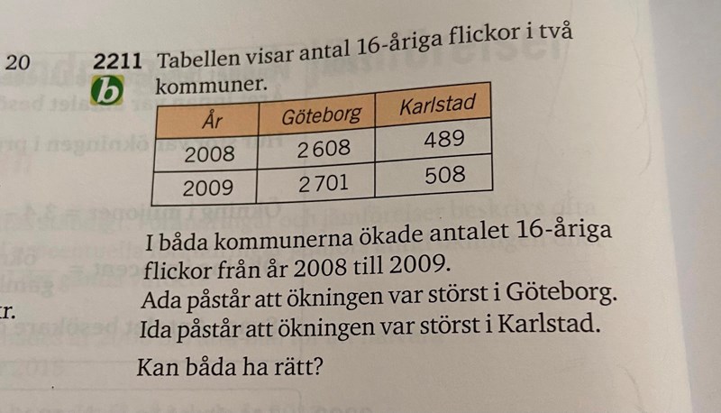 Jämför i vilken stad ökningen var störst till antal respektive procentuellt. T.ex. ger en ökning från 1 till 2 en 100% ökning men till antal sett är det bara en ökning på 1 person. Lika så ger t.ex. en ökning från 50 till 75 en 50% ökning men till antal sett är det 25 personer fler.