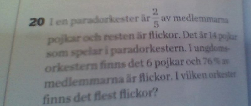 Pojkar: 2/5 * x = 14 vilket ger x = 35 personer i orkestern