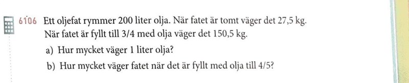 "När fattet är fyllt till 3/4 med olja väger det 150,5" 3/4 av 200 är 150. Alltså har man 150 liter olja i fatet och då väger fatet 150,5kg. Sedan tar du bort fatets vikt när det är tomt. och då har du kvar 150 liter olja som då väger 123kg.