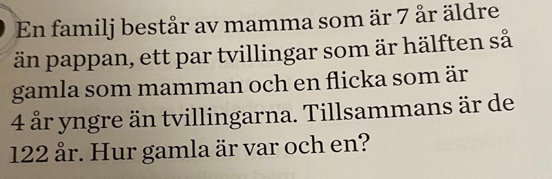 Smaragdalena skrev:I frågan står det ”4 år yngre än tvillingarna” menar de inte båda då? . Det är väll det det står, att x är mammans ålder?