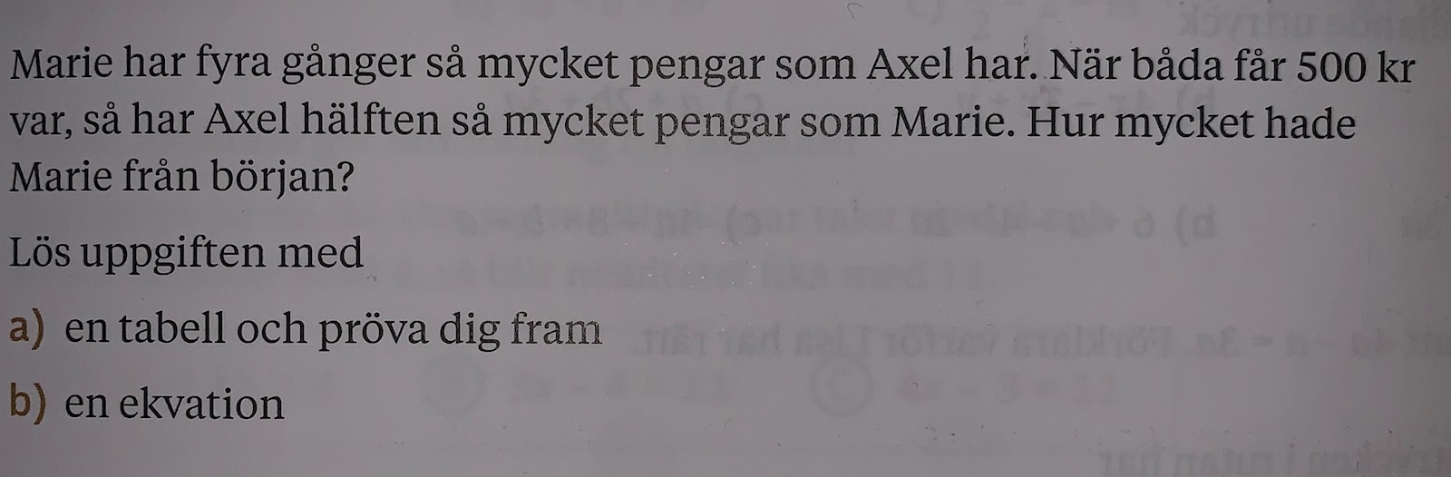 (Detta betyder ju att Axel har lika mycket pengar som halva Maries summa)