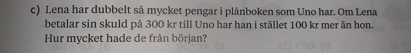 Lena har 2x–300 efter, Uno har x+300.