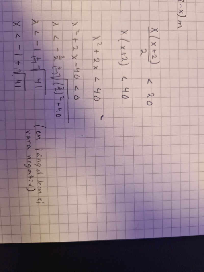 Arean ska vara mindre än 20 cm2 och längden 10 cm fås när arean är 20 cm2. Detta ger att längden måste vara kortarr än 10 cm och längre än 0 cm då en längd inte kan vara negativ.