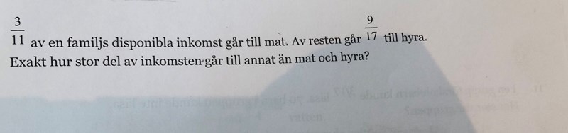 haraldfreij skrev:Det är inte 8/17 av inkomsten som går till annat än hyra, utan 8/17 av den delen av inkomsten som inte går till mat. När man räknar på andelar av andelar, så är det multiplikation som gäller. Hälften av en tredjedel är ju (tänk hälften av en tredjedels pizza = en sjättedels pizza). I det här fallet vill du alltså beräkna 8/17 av 8/11, alltså