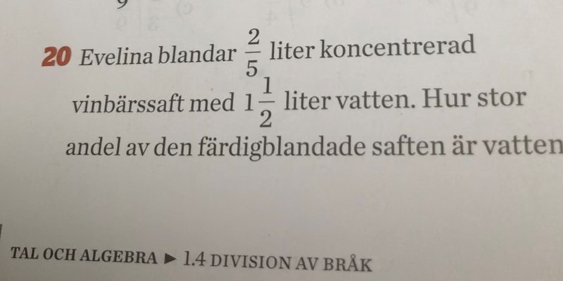 När Evelina har blandat ihop de två ingredienserna har hon alltså totalt 0,4 + 1,5 = 1,9 liter färdigblandad saft.