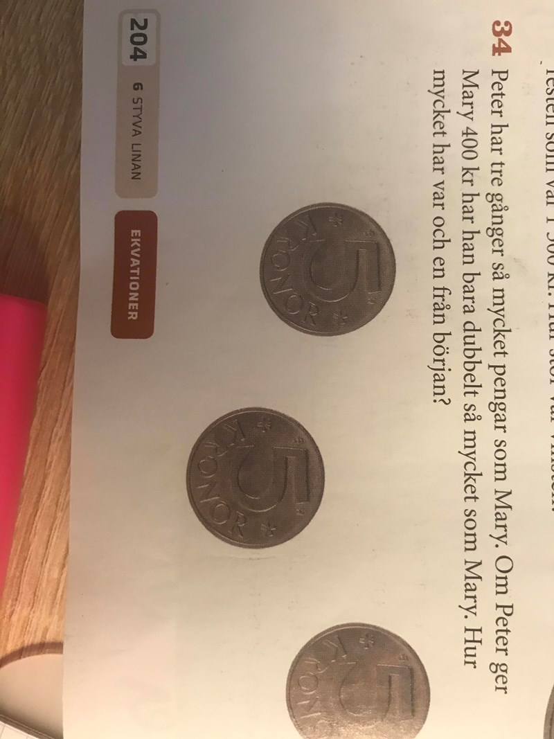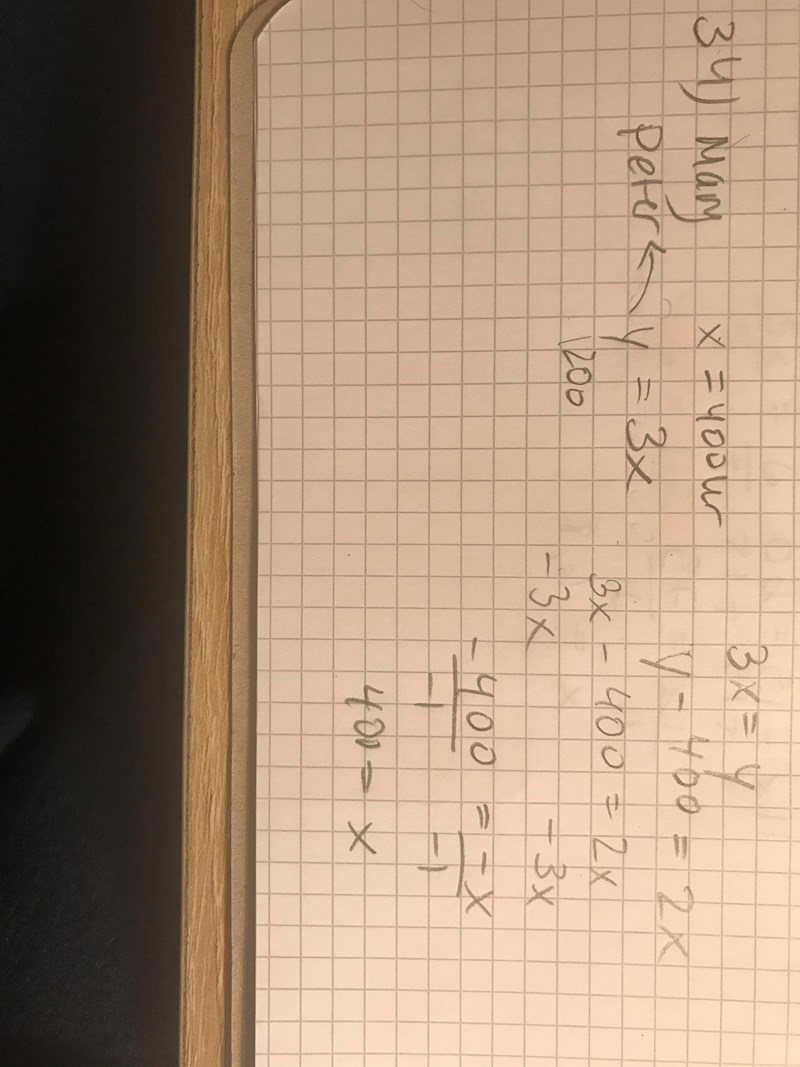 I facit står det att Mary har 1200 kr och Peter har 3600kr . Men jag fick Mary har 400kr och Peter har 1200kr. Men båda svaren stämmer enligt beskrivningen i texten. Eller tänker jag för?