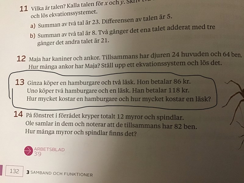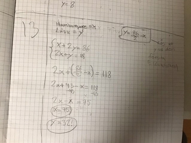 Jag fick att en hamburgare kostar 75 kr och en läsk 32 kr. Fast facit säger att en hamburgare kostar 50 kr och en läsk 18 kr. Har jag gjort något fel, slarvfel eller är det facit som är fel? Tacksam för svar : )