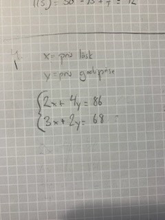 Albin och Joakim ska ha en filmkväll och köper läsk och godis. Albin betalar 86 kr för två läsk och fyra godispåsar. Joakim köper tre läsk och två godispåsar och betalar 68 kr. Låt priset för en läsk vara kr och för en godispåse kr. Ställ upp ett ekvationssystem och beräkna vad en läsk respektive en godispåse kostar.