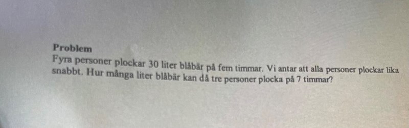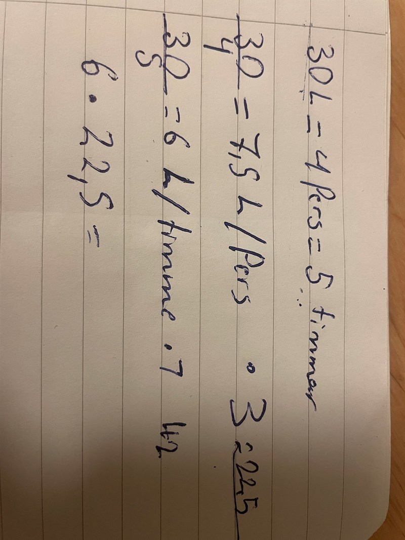 3 personer under 7h plockar 3*7*30/(4*5)=63/2=31.5 liter.