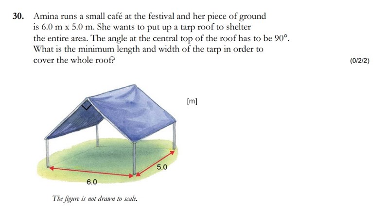 Amina driver ett café på ett festival och hennes bit av mark är 6.0 mx 5.0 m. Hon vill lägga till ett tak av presenning över hela området. Vinkeln i den centrala toppen av taket ska vara 90 grader. Hur lång längd och bredd ska presenningen minst ha?