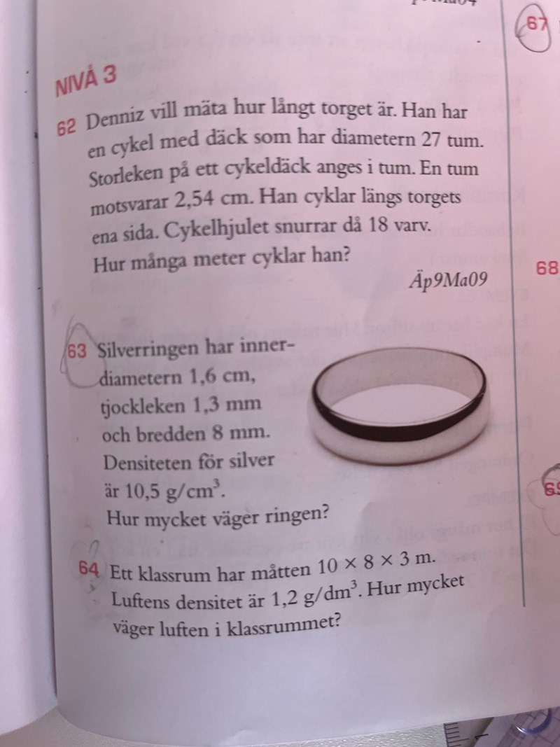 Hej skulle någon kunna hjälpa mig med 67. Jag räknade ( 1,6 x pi )x 0.13 x 0.08 ~ 0,522