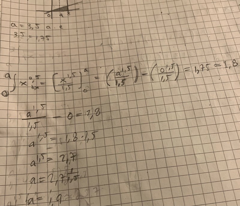 Givet är funktion f(x) = ”roten ur x”. Grafen till funktionen och linjen x=3 begränsar med x-axeln ett område. Områdets area är 3,5 a.e. Linjen x = a delar området i två lika stora delar. Bestäm a.