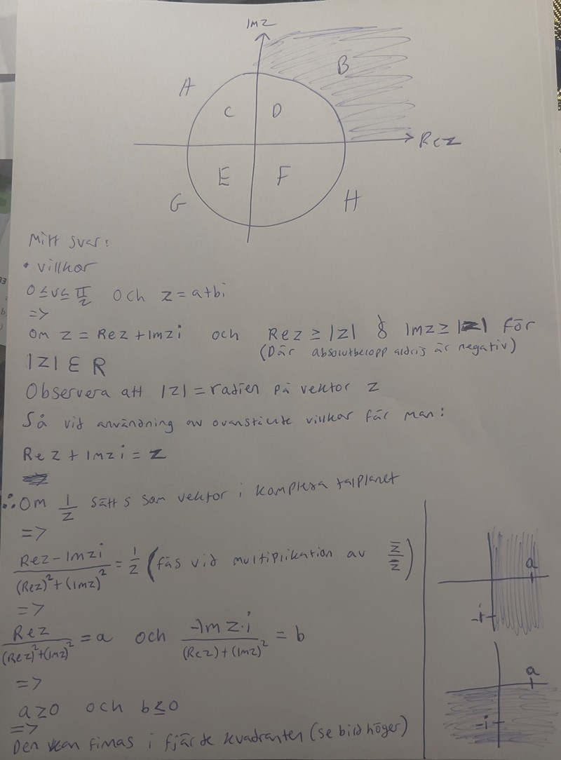 Fråga: I figuren är åtta olika områden i det komplexa talplanet markerade med A, B, C, D, E, F, G och H. Cirkeln är en enhetscirkel med centrum i origo. Cirkeln och koordinataxlarna ingår inte i något av de markerade områdena