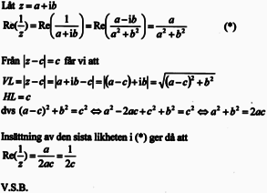 Antag att det komplexa talet z är sådant att ∣z−c∣=c, där z ≠ 0 och c är ett reellt tal större än noll. Visa Re(1/z)=1/2c