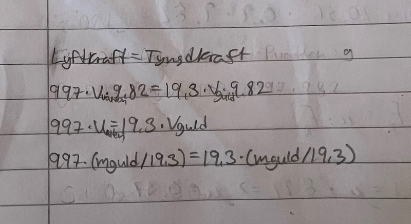Notera att du också har ett konstigt värde på i dina beräkningar. Guld måste ju ha högre densitet än vatten! Du har angivit vattnets densitet till ungefär 1000kg/m³. Guldets densitet måste anges i samma enheter, alltså