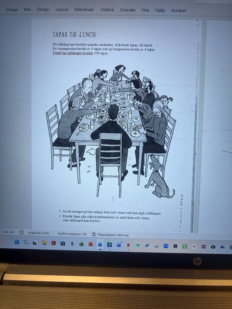 en vuxen portion ger 9 tapas, en barn portion 4 tapas, totalt är det 108 taps rätter. beräkna matte uppgiften : hur många vuxna och barn fins det i selskapet?