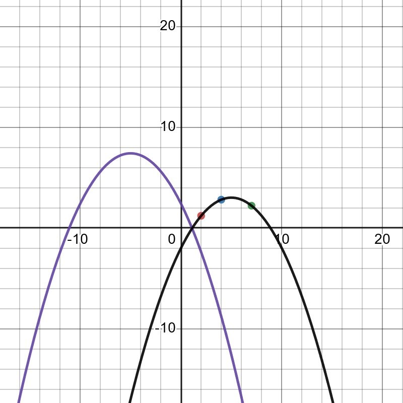 Det finns inga värden på nollställen eller symmetrilinje i denna uppgift. För att få fram funktionsuttrycket försöker jag använda mig av ett ekvationssystem.