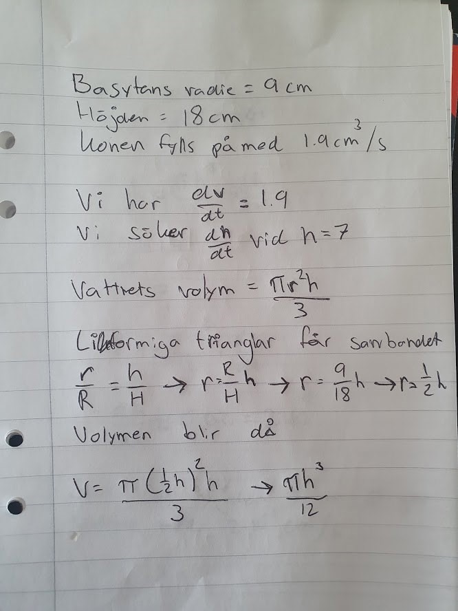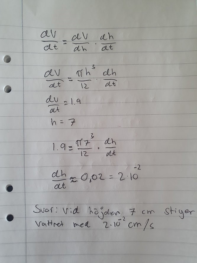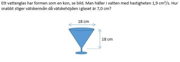 Hej. Har lite problem med denna uppgift. Fattar inte riktigt hur jag ska börja. Det jag förstår är att man på nått sätt ska räkna derivatan när vattnet är vid höjden 7 cm, men kommer inte så mycket längre.