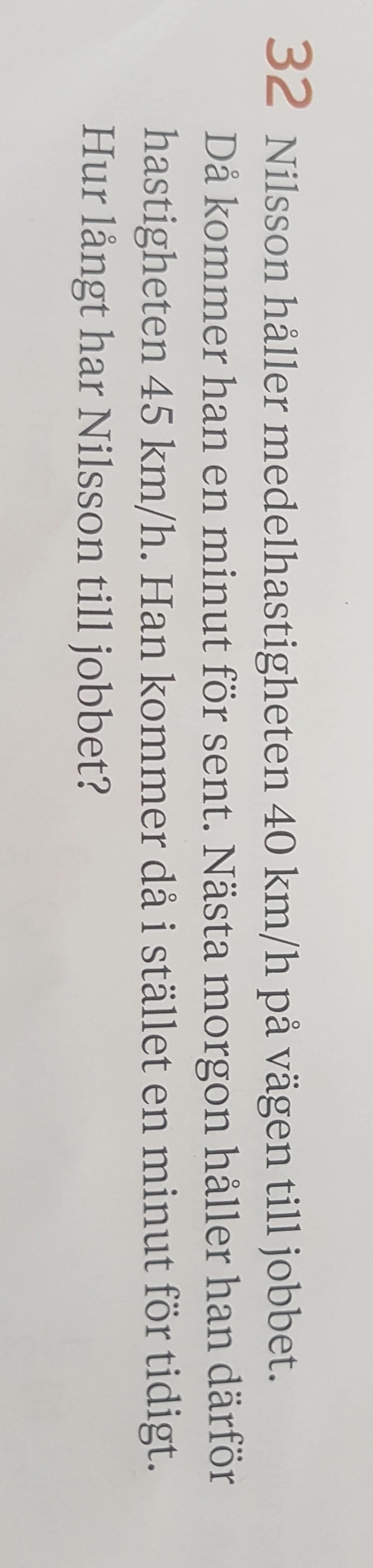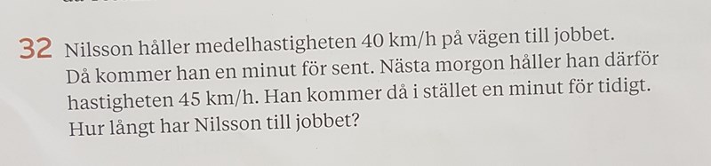 Sträckan är ju densamma i båda fallen. Använd dig av formeln s=vt. Man kan skriva om hastigheterna till 40/60 respektive 45/60 km/minut så blir det enkla siffror att räkna med.