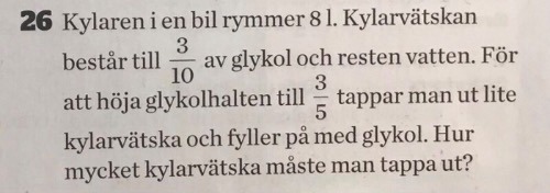 Jag har kommit fram till att från början var det 3/10 glykol och 7/10 vatten. 3/10 av 8 liter kylarvätska  är 24/10 liter glykol. Sedan ska det bli 48/10 liter glykol. Sen vet jag inte hur jag ska göra…