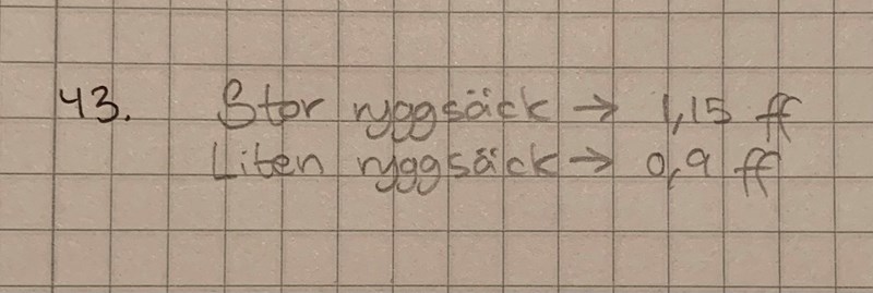 Jag kallar priset på den stora ryggsäcken före förändringen för S. Priset för den stora ryggsäcken efter förändringen blir 1,15*S