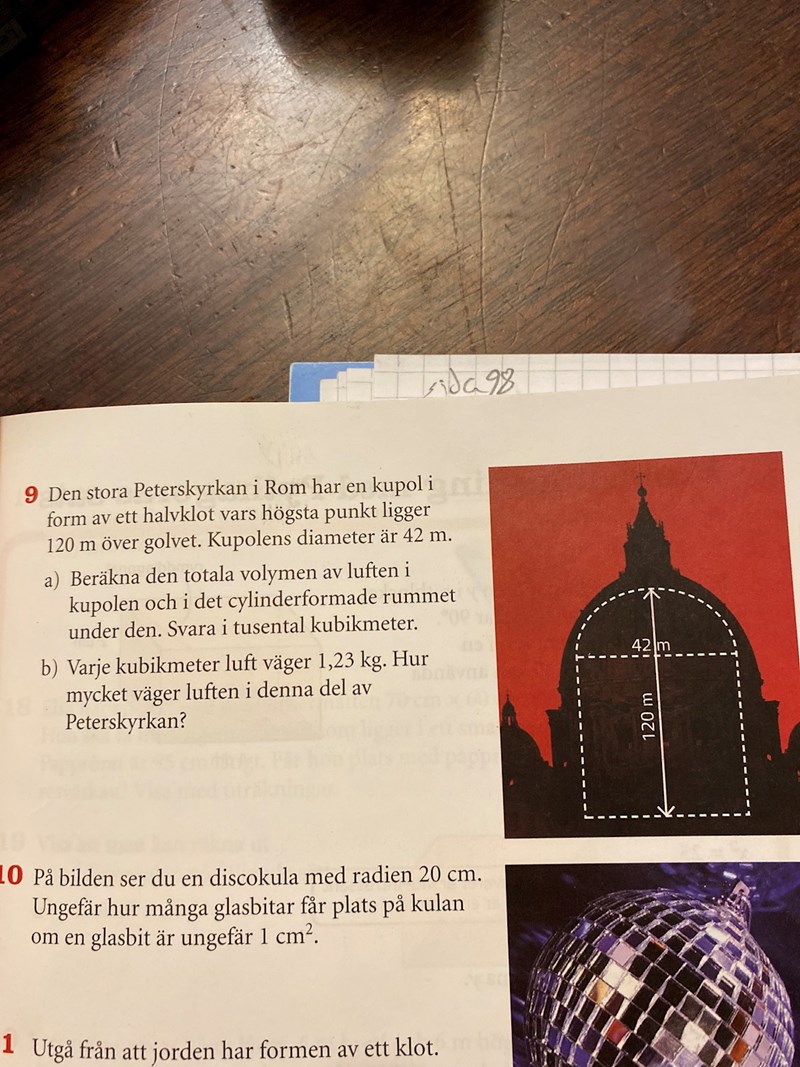 Uppgiften leder som såhär ”Den stora Peterskyrkan i Rom har en kupol i form av ett halvklot vars högsta punkt ligger 120 m över golvet. Kupolens diameter är 42 m.
