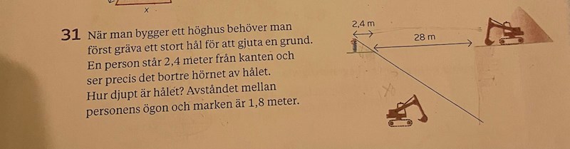 Och en stor med den längre kateten 28 m och den okända kortare som vi kallar x.