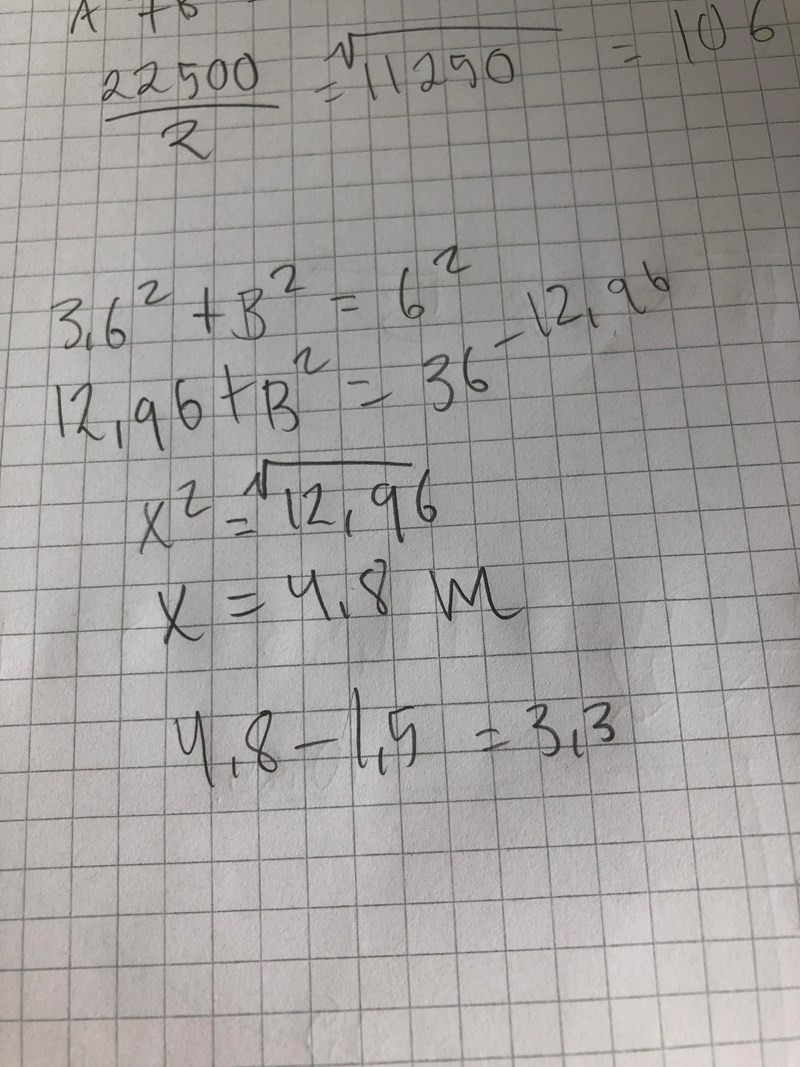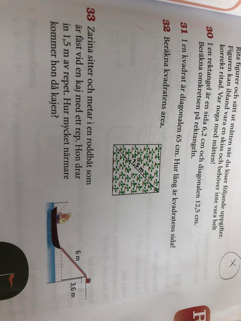 Det är hypotenusan (dvs den sida i triangeln som utgörs av repet) som minskar med 1,5 meter. Du måste först räkna ut avståndet till kajen när hypotenusan är 6 meter och höjdskillnaden är 3,6 meter. Sen måste du istället avgöra hur stort avståndet är om hypotenusan minskar till 6-1,5 meter och höjdskillnaden är fortsatt 3,6 meter.