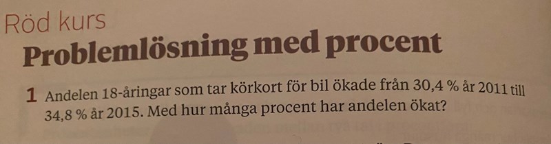 Hur många procentenheter har andelen ökat? Detta skall vara i täljaren. Nämnaren skall vara vad-det-var-från-början.