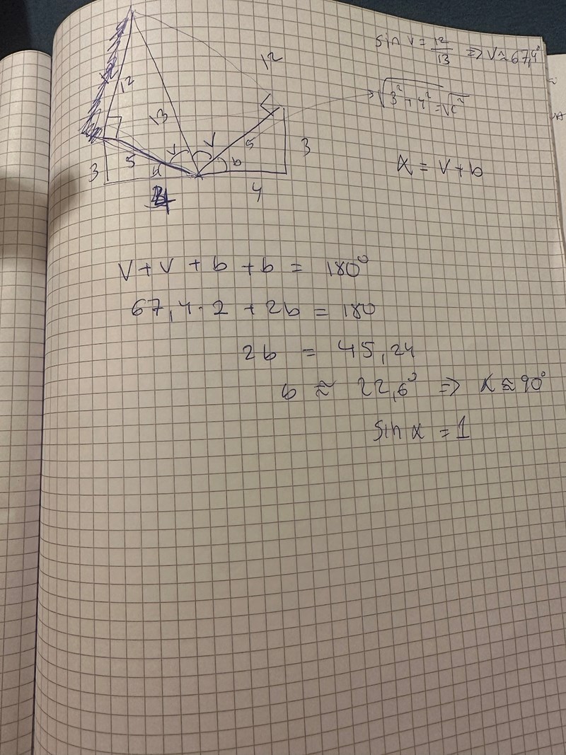 Samtidigt kan vinkeln delas i två som ingår i de två rätvinkliga trianglarna.