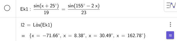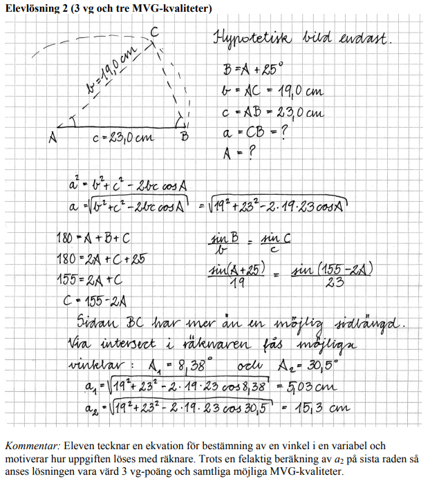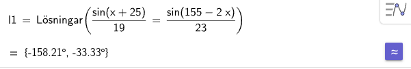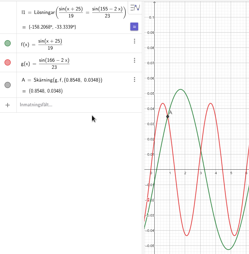 Jag sökte runt lite och hittade ett mer fördjupat facit och exempel på svar. Inget verkar hjälpa dock för det enda som står angående mitt problem är "via intersect i räknaren fås möjliga vinklarna A(1) och A(2)" och allt annat är precis som jag försökt.
