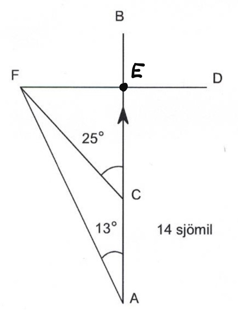 Ett fartyg rör sig enligt figuren från A mot B. F är en fyr och vinklarna 13°och 25° är de vinklar som uppmätts mellan fartygets rörelseriktning och fyren i punkterna A respektive C. Avståndet mellan A och C är 14 sjömil. Utefter FD som är vinkelrät mot AB ligger ett grund 8 sjömil från F. Kommer fartyget att gå på grundet?