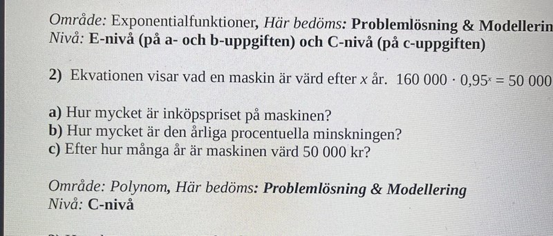 En maskins värde efter x år kan beskrivas med hjälp av uttrycket 160000•0,95x.