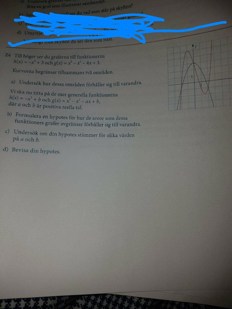 För att bevisa detta så skall du genomföra a uppgiften men denna gång med de generella funktionerna h(x) =-x^2+b och g(x) x^3-x^2-ax+b och därmed visa att areorna blir lika stora oavsett värdena på a och b. (ja inte lika stora hela tiden men de två areorna är lika stora när a och n har ett visst värde). Du kommer samtidigt visa att värdet på en av a och b inte påverkar areorna.