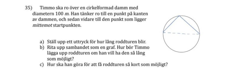 Hej! Har fastnat på följande uppgift. Jag har börjat att tänka enligt Thales sats/följdsats av randvinkelsatsen för att konstatera att triangeln är rätvinklig, och vidare att Pythagoras sats skulle kunna användas. Men kommer inte vidare och förstår inte hur ett uttryck och graf ska kunna bestämmas.