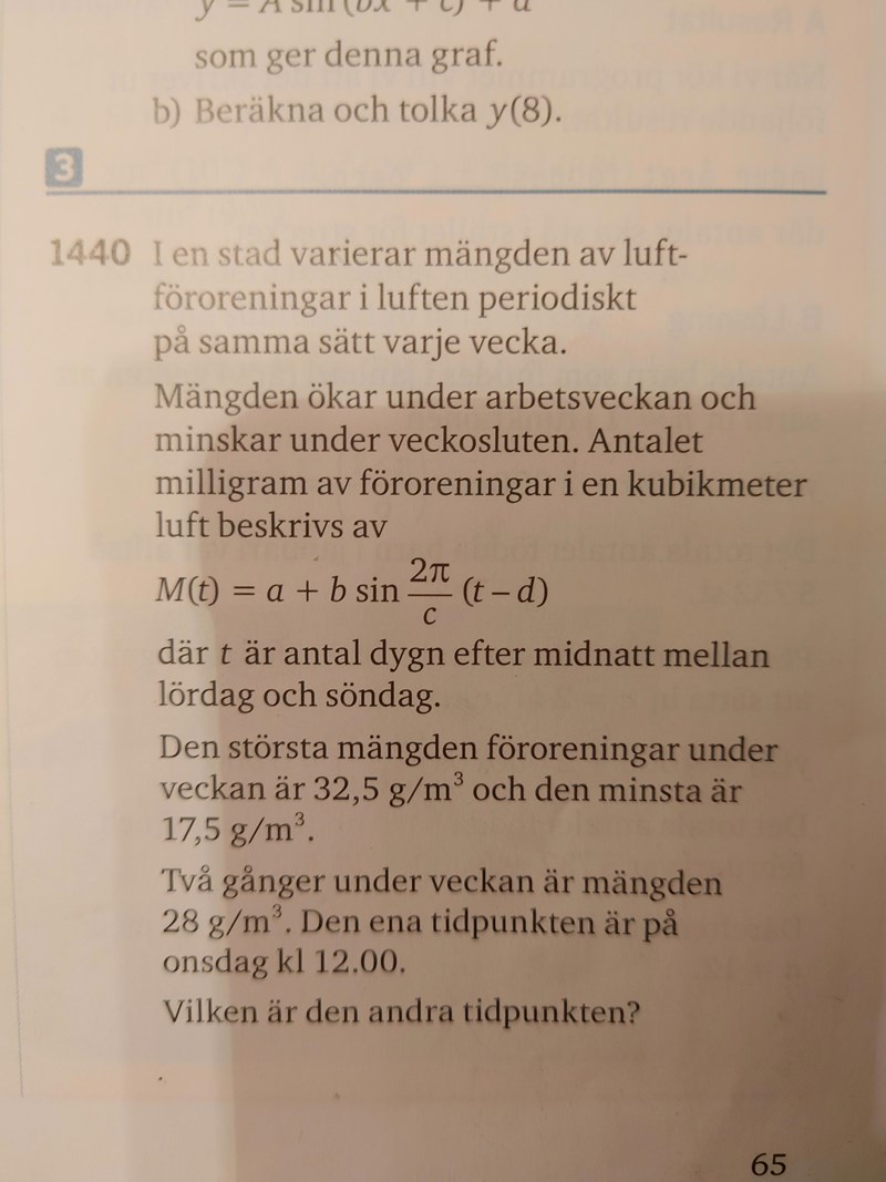 Vi börjar med att konstatera att facit har fel, tycker jag. Hur kan man veta att det är fel i facit? Jo, för det första frågar de efter "den andra tidpunkten", d.v.s. singular. Då kan man inte svara med 2 tidpunkter. Koncentrationen är 28 två gånger per vecka. Den ena gången kl 12 på onsdag. Den andra är okänd. Deras första svar t=0,92 skulle innebära att koncentrationen är 28 strax innan midnatt mellan söndag och måndag vilket strider mot "minskar under veckosluten". Alltså, ignorerar vi facit och försöker lösa uppgiften!