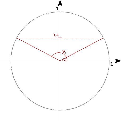vi söker alltså vinklar vars sinusvärde är 0,4. Enhetscirkeln kanske du känner till. Där ser vi hur vinklarna ligger: