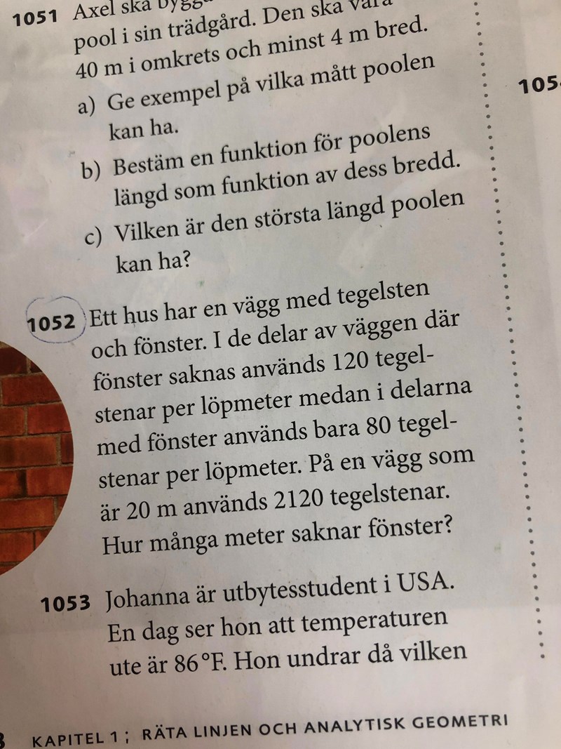 Det är 20-x meter med fönster. Det går åt 80 tegelstenar för att bygga 1 m vägg med fönster. Det går åt 80(20-x) tegelstenar för att bygga 20-x meter vägg med fönster.