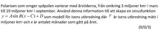 Sen vet jag att perioden blir eftersom det är 12 månader på ett år. Sen kom jag fram till att om jag jämför med en sinuskurva utseende början det på den horisontella symetrilinjen därefter går den till max-värde i det här fallet när x=3 vilket är i mars. Men när det är mars måste det vara en minimipunkt vilket jag insåg att funktionen måste vara -sin(...).