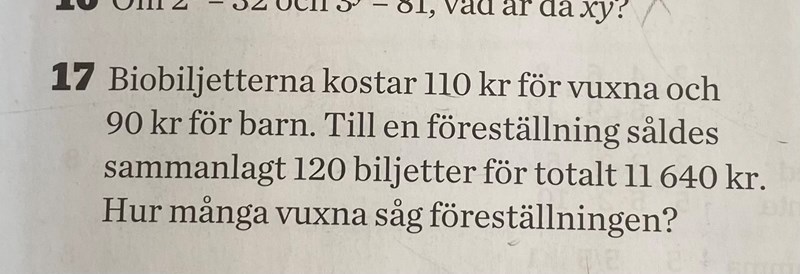 Då du har två okända variabler, antal vuxna och antal barn behöver du två ekvationer för att lösa uppgiften.
