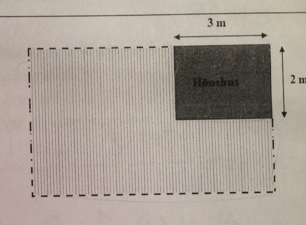 Du vill ha en maximal area. Arean beräknas som basen gånger höjden, minus hönshus-arean (som är 3x2=6 m^2), dvs