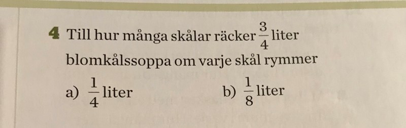 I det här fallet så har du 3/4 liter soppa som du vill dela upp i a) skålar som rymmer 1/4 liter och b) 1/8 liter.