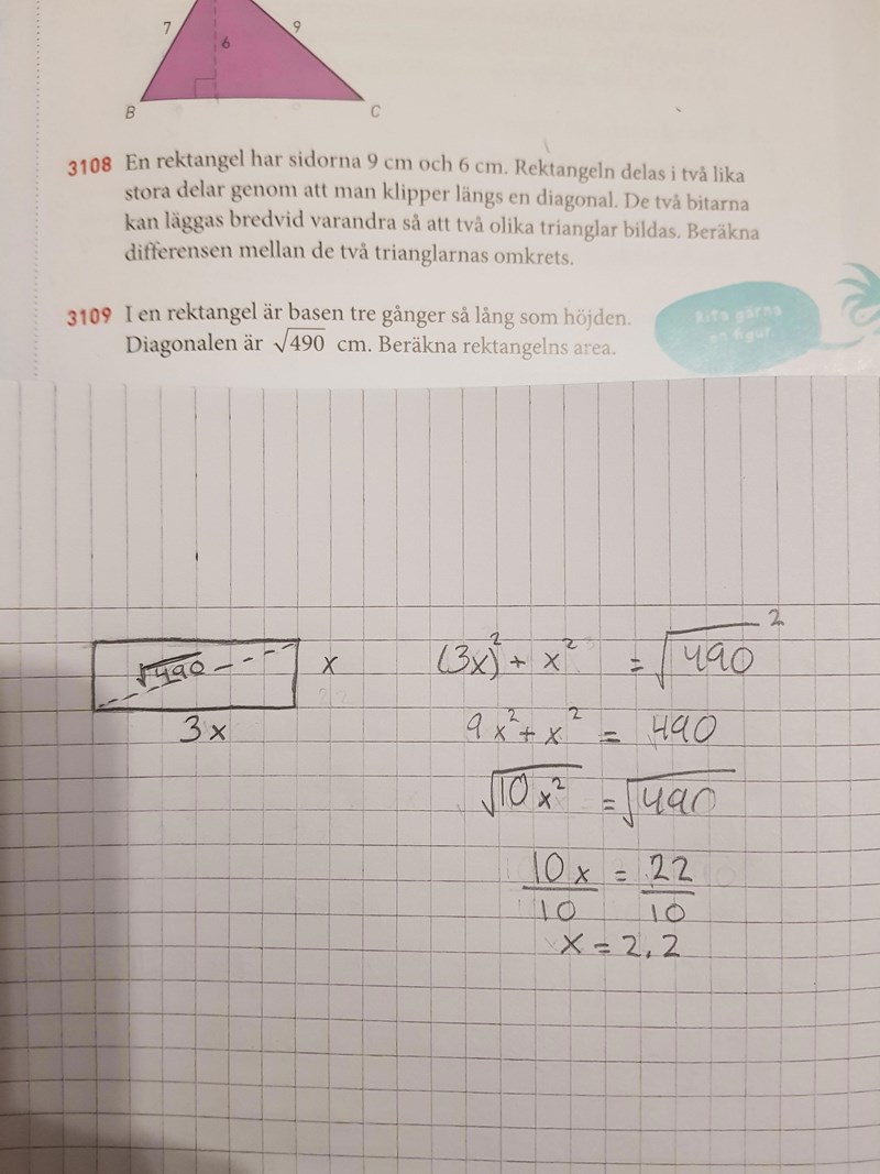Det ser bra ut fram till och med raden 9x2+x2 = 490. Börja med att förenkla VL. Dela med nånting så att du bara får x2 i VL. Dra roten ur båda led.