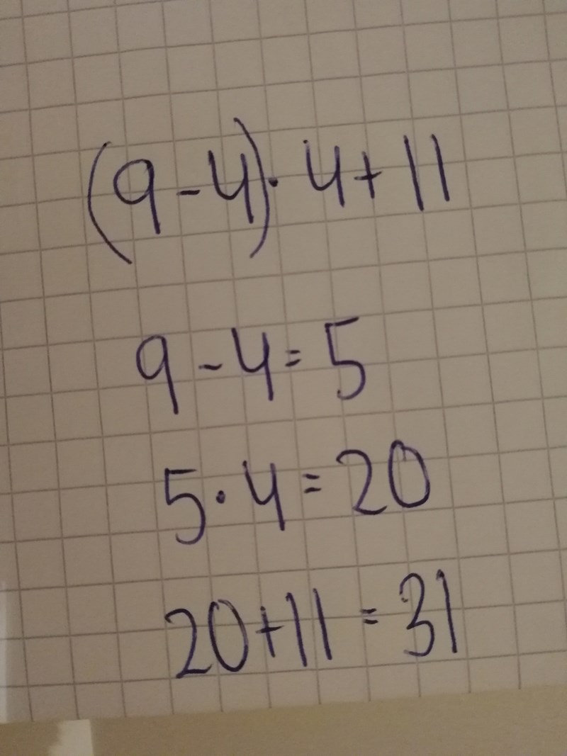 ( 9-4) *( 4+11) blir däremot (5) (15) = 75 (alltså 5*15 = 75)