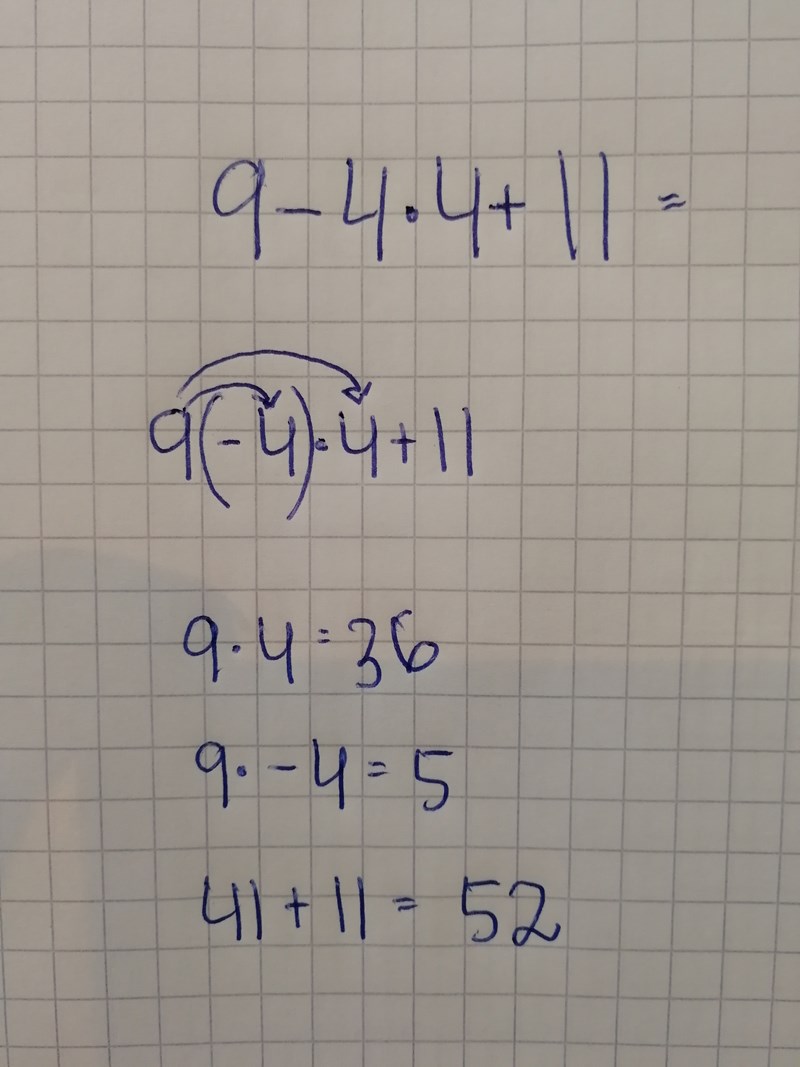 9 - 4 (4+11) får vi då, 9 - 4 (15). Vilket ger, 9 - 4*15 = 9-60 = -51.