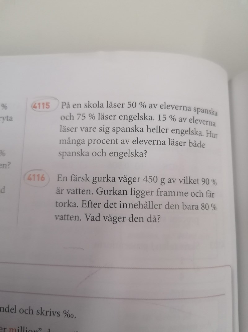 Gurkan:Först väger gurkan 450g, varav 90 % är vatten. Då kan du räkna ut hur mycket det som inte är vatten väger.Sedan försvinner en del vatten, men det som inte är vatten har inte ändrat sin vikt och utgör nu en större del av gurkans vikt.
